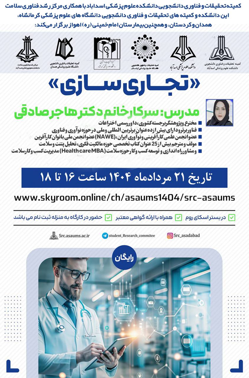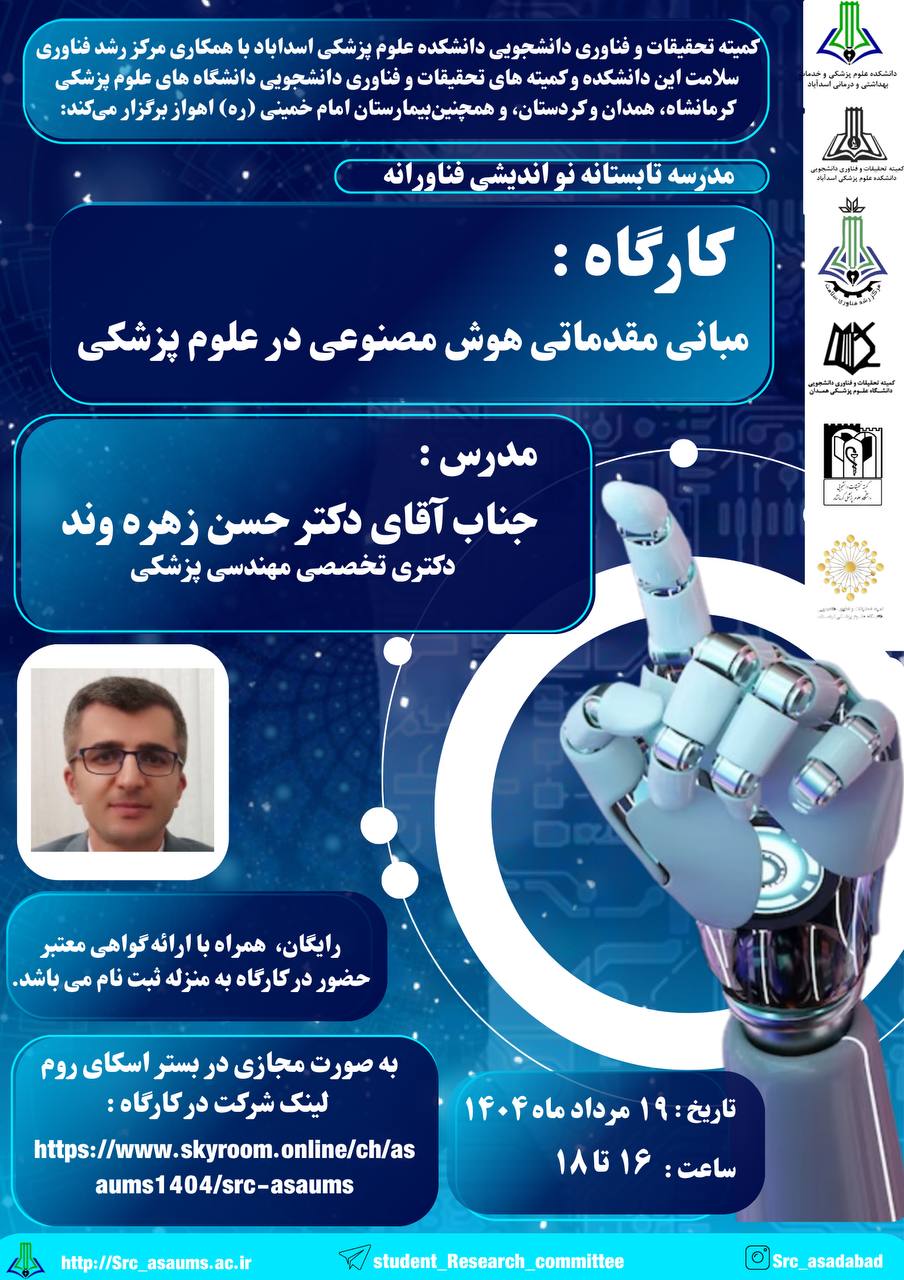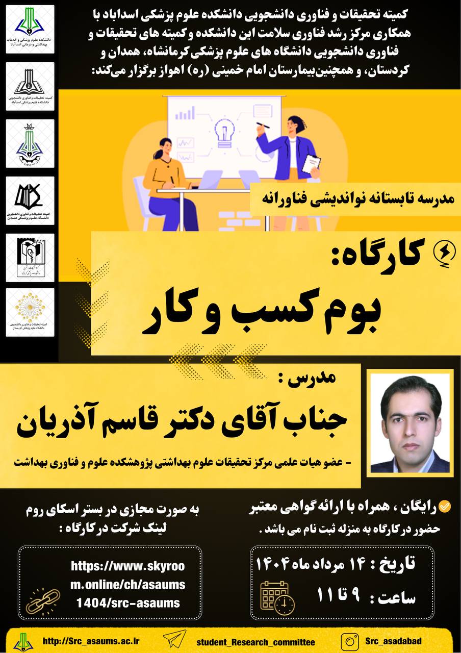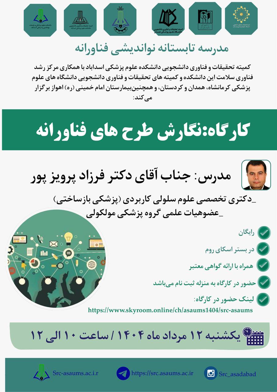 معاونت آموزش، تحقیقات و فناوری دانشکده علوم پزشکی اسدآباد برگزار میکند: کارگاه آشنایی با طرحهای تحقیقاتی اثرگذار زمان برگزاری: 31/6/1404 ساعت برگزاری: 13-11 مدرس: سرکار خانم دکتر ویدا قاسمی استادیار بهداشت باروری گروه هدف: اعضای محترم هیأت علمی محل برگزاری: کلاس1 معاونت آموزشی