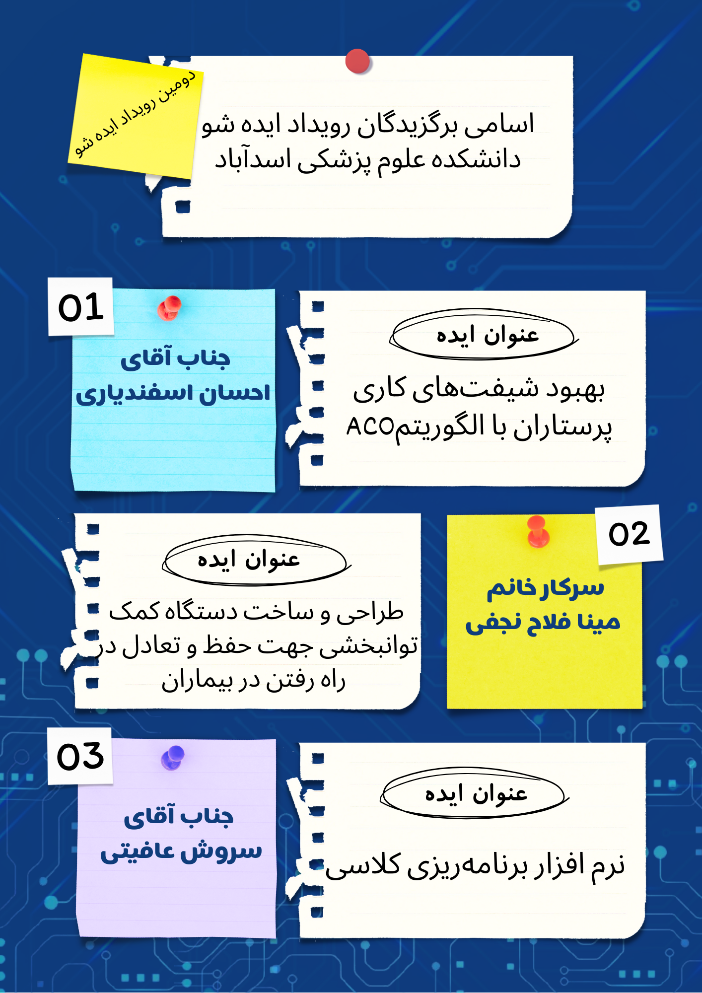 در پایان نیز پس از بررسی و اعلام نظر داوران ایده‌های برتر معرفی و با اهدای لوح و جوایز نقدی از برگزیدگان تقدیر به عمل آمد.
